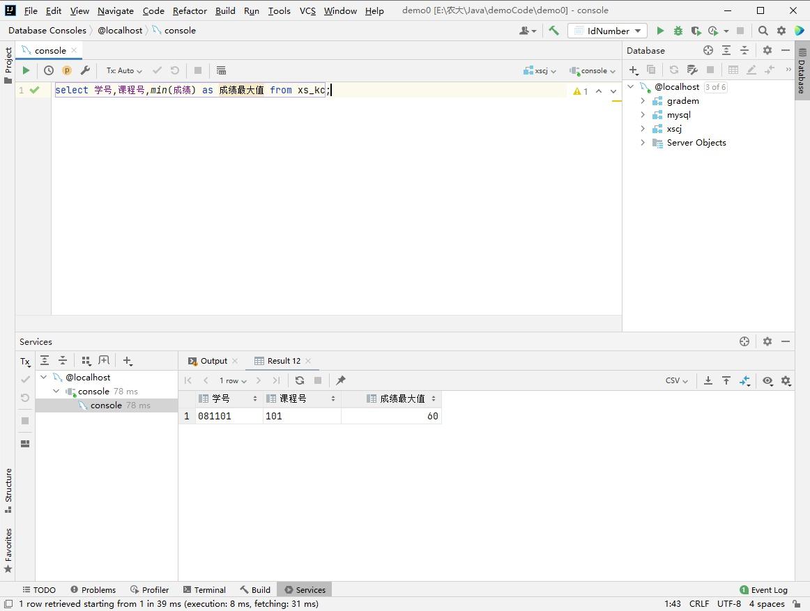 SQLselect 学号,课程号,min(成绩) as 成绩最大值 from xs_kc;运行结果