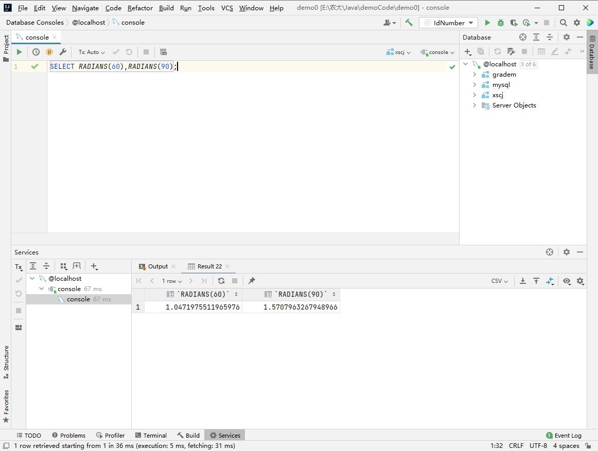 SQLSELECT RADIANS(60),RADIANS(90);运行结果