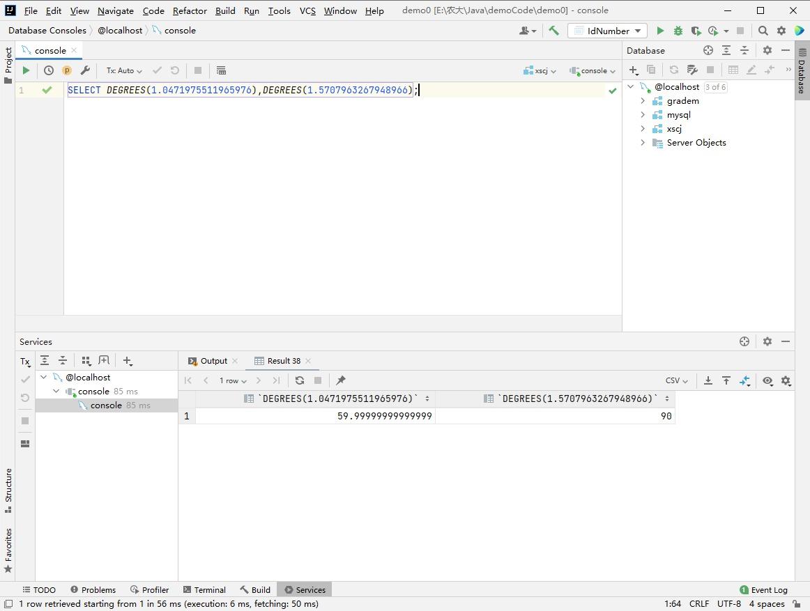 SQLSELECT DEGREES(1.0471975511965976),DEGREES(1.5707963267948966);运行结果