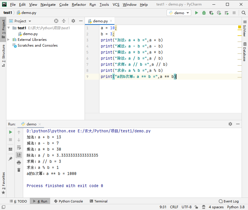 pythona = 10; b = 3; print("加法:a + b =",a + b) print("减法:a - b =",a - b) print("乘法:a * b =",a * b) print("除法:a / b =",a / b) print("求商:a // b =",a // b) print("求余:a % b =",a % b) print("a的b次幂:a ** b =",a ** b)运行效果