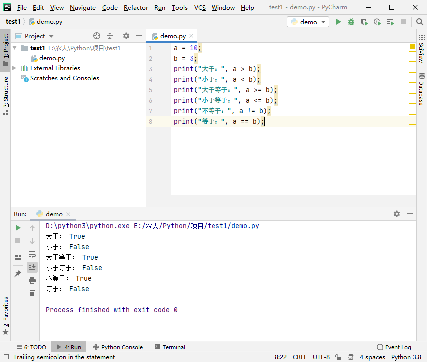 pythona = 10; b = 3; print("大于:", a > b); print("小于:", a < b); print("大于等于:", a >= b); print("小于等于:", a <= b); print("不等于:", a != b); print("等于:", a == b);运行效果