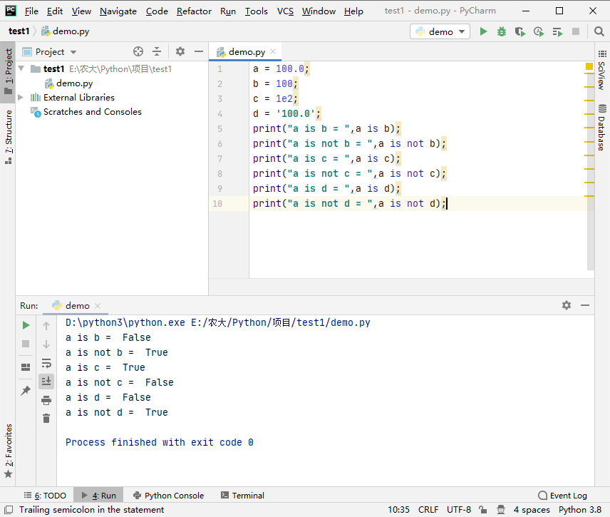 pythona = 100.0; b = 100; c = 1e2; d = '100.0'; print("a is b = ",a is b); print("a is not b = ",a is not b); print("a is c = ",a is c); print("a is not c = ",a is not c); print("a is d = ",a is d); print("a is not d = ",a is not d);运行效果