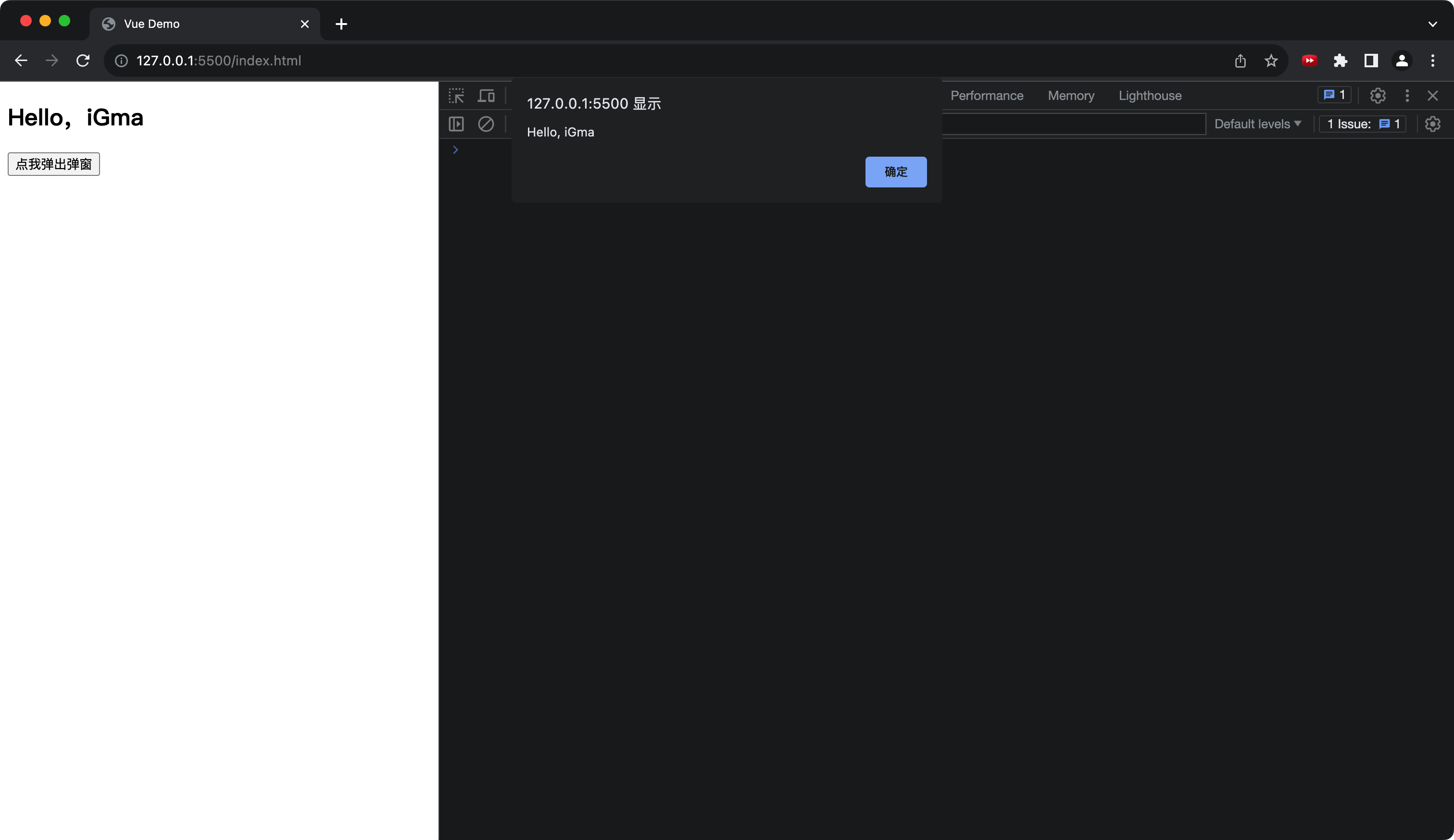 html<body> <div id="root"> <h2>Hello,{{ name }}</h2> <button v-on:click="showInfo">点我弹出弹窗</button> </div> <script> new Vue({ el: '#root', data: { name: 'iGma' }, methods: { showInfo() { alert(`Hello, ${this.name}`); } } }) </script> </body>运行结果