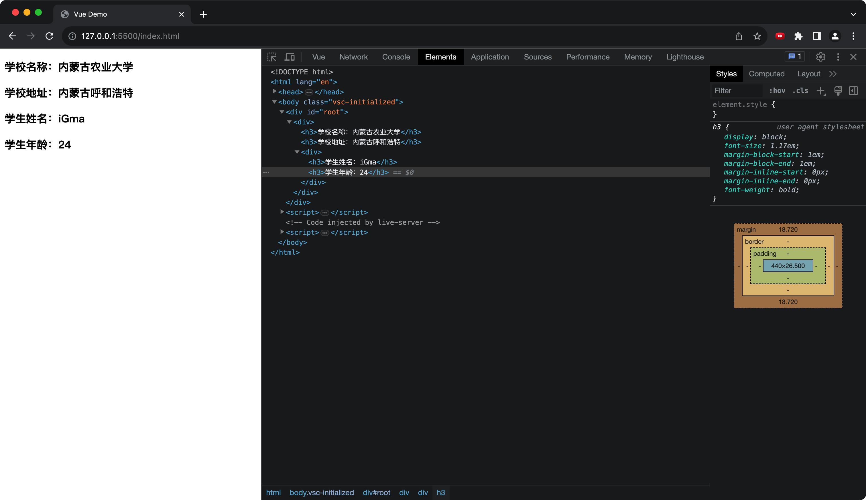 html<body> <div id="root"> <school></school> </div> <script> // 定义学生组件 const student = Vue.extend({ template: ` <div> <h3>学生姓名:{{ name }}</h3> <h3>学生年龄:{{ age }}</h3> </div> `, data(){ return { name: 'iGma', age: 24 } } }) // 定义父组件 school const school = Vue.extend({ template: ` <div> <h3>学校名称:{{name}}</h3> <h3>学校地址:{{address}}</h3> <student></student> </div> `, data(){ return { name: '内蒙古农业大学', address: '内蒙古呼和浩特' } }, components: { student } }) // new Vue 实例,在 components 中引入父组件 new Vue({ el: '#root', components: { school } }) </script> </body>运行结果