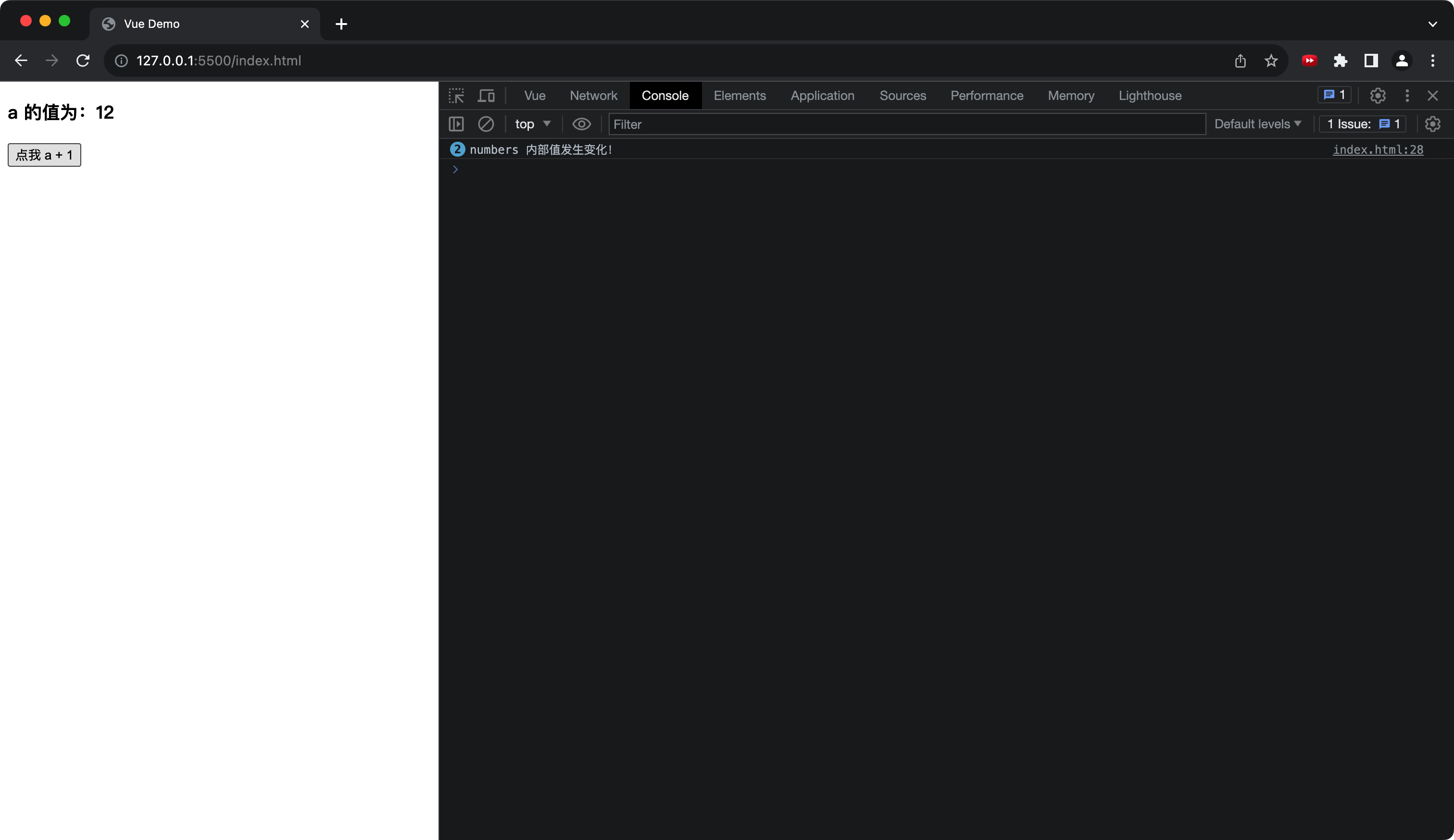 html<body> <div id="root"> <h3>a 的值为:{{ numbers.a }}</h3> <button @click="numbers.a++">点我 a + 1</button> </div> <script> new Vue({ el: '#root', data: { numbers: { a: 10, b: 20 } }, watch: { numbers: { deep: true, handler(newValue, oldValue) { console.log('numbers 内部值发生变化!'); } } } }) </script> </body>运行结果