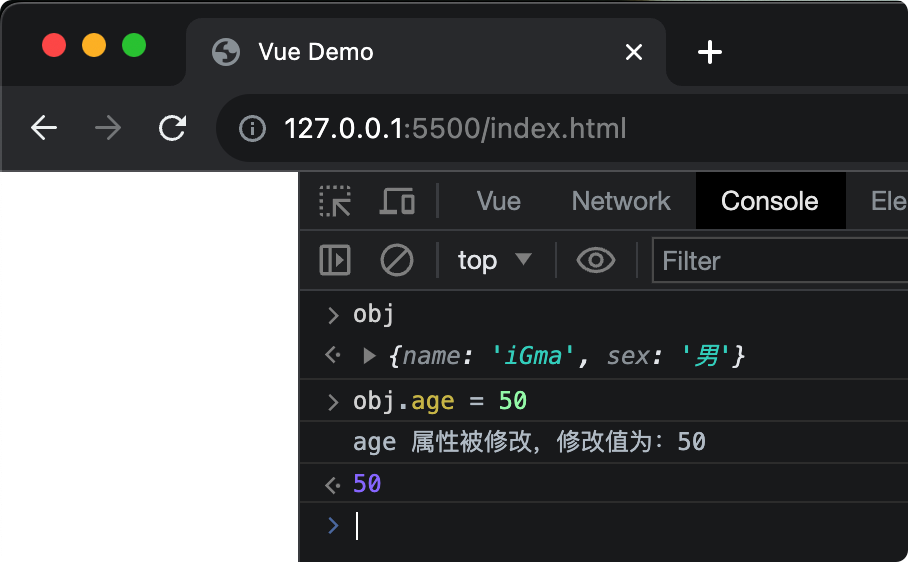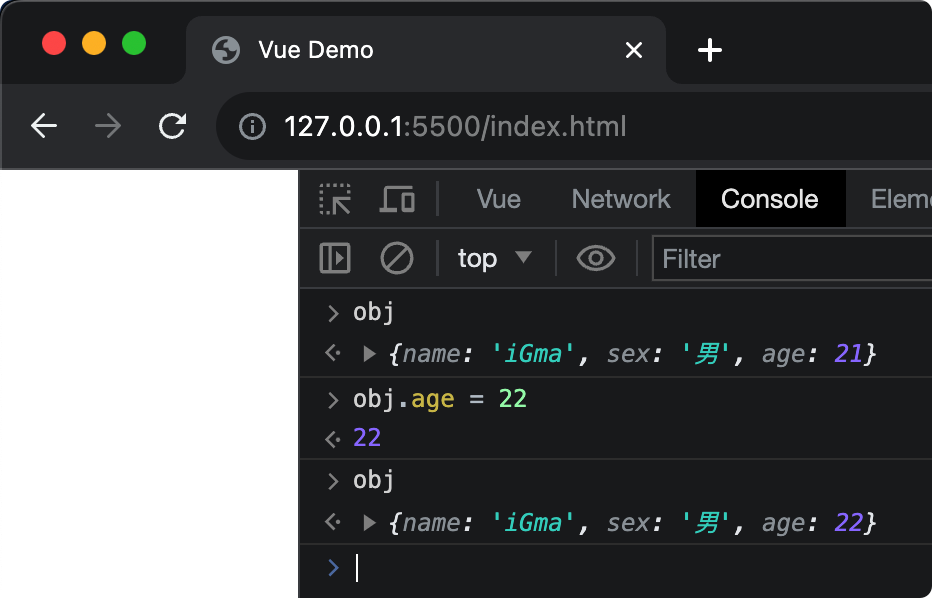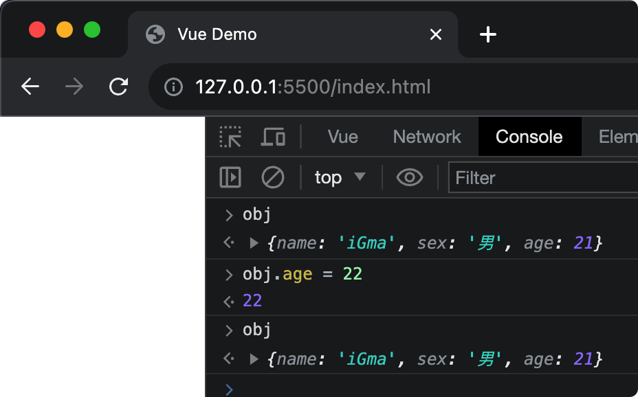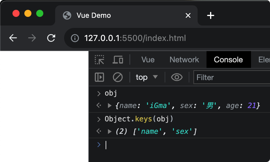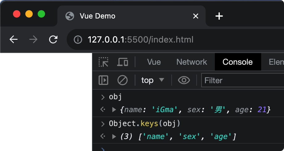 html<!DOCTYPE html> <html lang="en"> <head> <meta charset="UTF-8"> <title>Vue Demo</title> </head> <body> <script> let obj = { name: 'iGma', sex: '男' } Object.defineProperty(obj,'age',{ value: 21, // 值 }) </script> </body> </html>在控制台中使用 Object.keys() 方法打印 obj 的所有 key,这时会发现,后添加的 age 属性不在数组中,如下图: