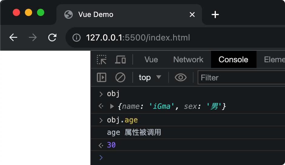 javascriptObject.defineProperty(obj, 'age', { /* 当调用 age 属性时执行的函数。返回 age 的值 value 和 get 是同一个作用,只能同时用一个。 */ get() { console.log("age 属性被调用"); return 30; } })运行结果