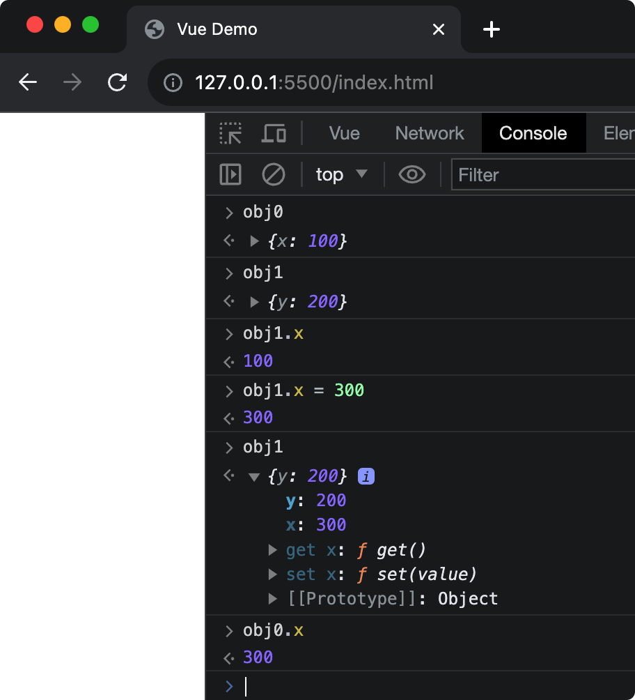 html<!DOCTYPE html> <html lang="en"> <head> <meta charset="UTF-8"> <title>Document</title> </head> <body> <script> let obj0 = { x: 100 }; let obj1 = { y: 200 }; Object.defineProperty(obj1,'x',{ get(){ return obj0.x; }, set(value){ obj0.x = value; } }) </script> </body> </html>运行结果