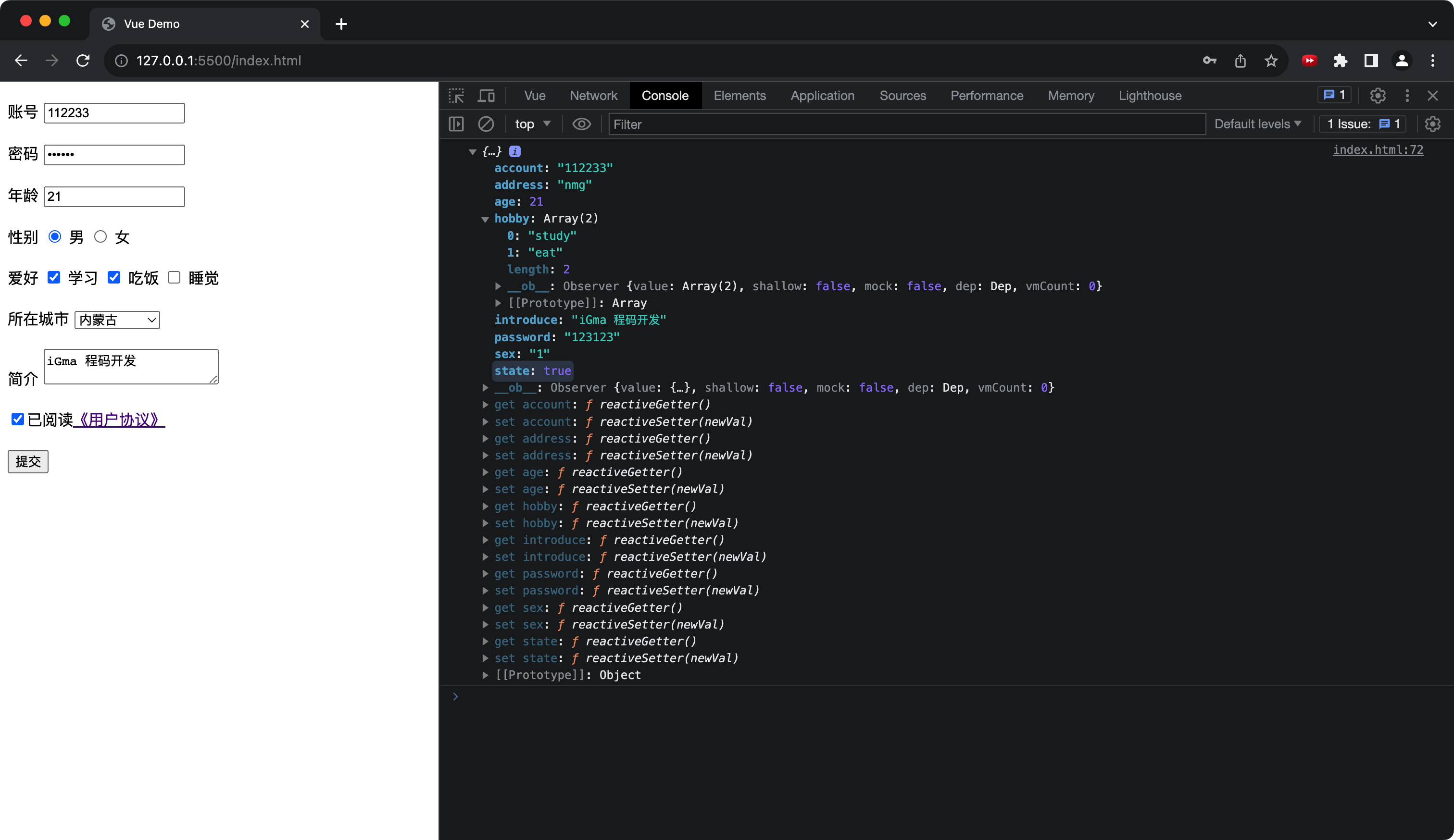 html<body> <div id="root"> <form @submit.prevent="updata"> <div class="item"> <label for="account">账号</label> <input type="text" id="account" v-model="info.account"> </div> <div class="item"> <label for="password">密码</label> <input type="password" id="password" v-model="info.password"> </div> <div class="item"> <label for="age">年龄</label> <input type="number" id="age" v-model.number="info.age"> </div> <div class="item"> <label>性别</label> <input type="radio" name="sex" value="1" v-model="info.sex"> 男 <input type="radio" name="sex" value="0" v-model="info.sex"> 女 </div> <div class="item"> <label>爱好</label> <input type="checkbox" value="study" v-model="info.hobby"> 学习 <input type="checkbox" value="eat" v-model="info.hobby"> 吃饭 <input type="checkbox" value="sleep" v-model="info.hobby"> 睡觉 </div> <div class="item"> <label>所在城市</label> <select v-model="info.address"> <option value="">请选择城市</option> <option value="nmg">内蒙古</option> <option value="bj">北京</option> <option value="sh">上海</option> <option value="wh">武汉</option> <option value="sz">深圳</option> </select> </div> <div class="item"> <label for="introduce">简介</label> <textarea id="introduce" v-model="info.introduce"></textarea> </div> <div class="item"> <input type="checkbox" v-model="info.state"><span>已阅读<a href="https://blog.igma.ink">《用户协议》</a></span> </div> <button>提交</button> </form> </div> <script> new Vue({ el: '#root', data: { info: { account: '', password: '', age: '', sex: '', hobby: [], address: '', introduce: '', state: '' } }, methods: { updata(){ console.log(this.info); } } }) </script> <style> .item { margin: 20px 0; } </style> </body>点击提交按钮后