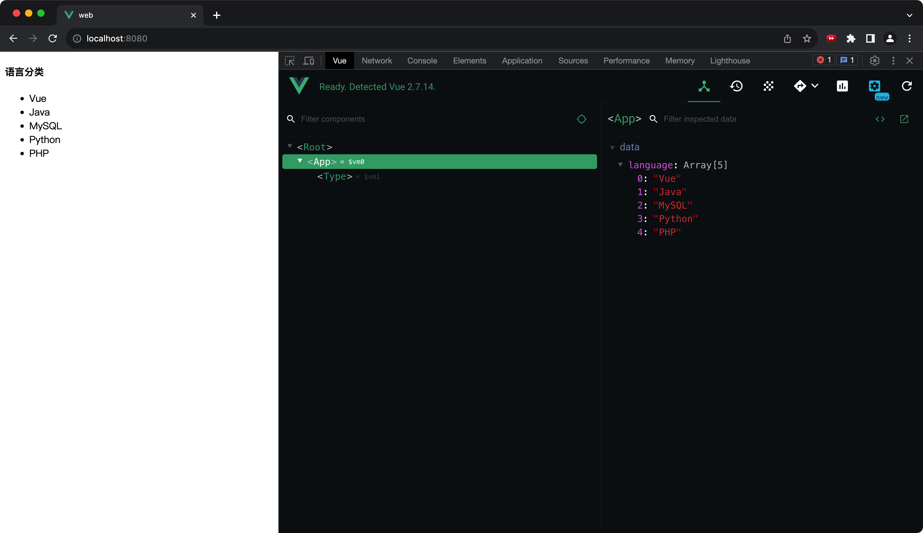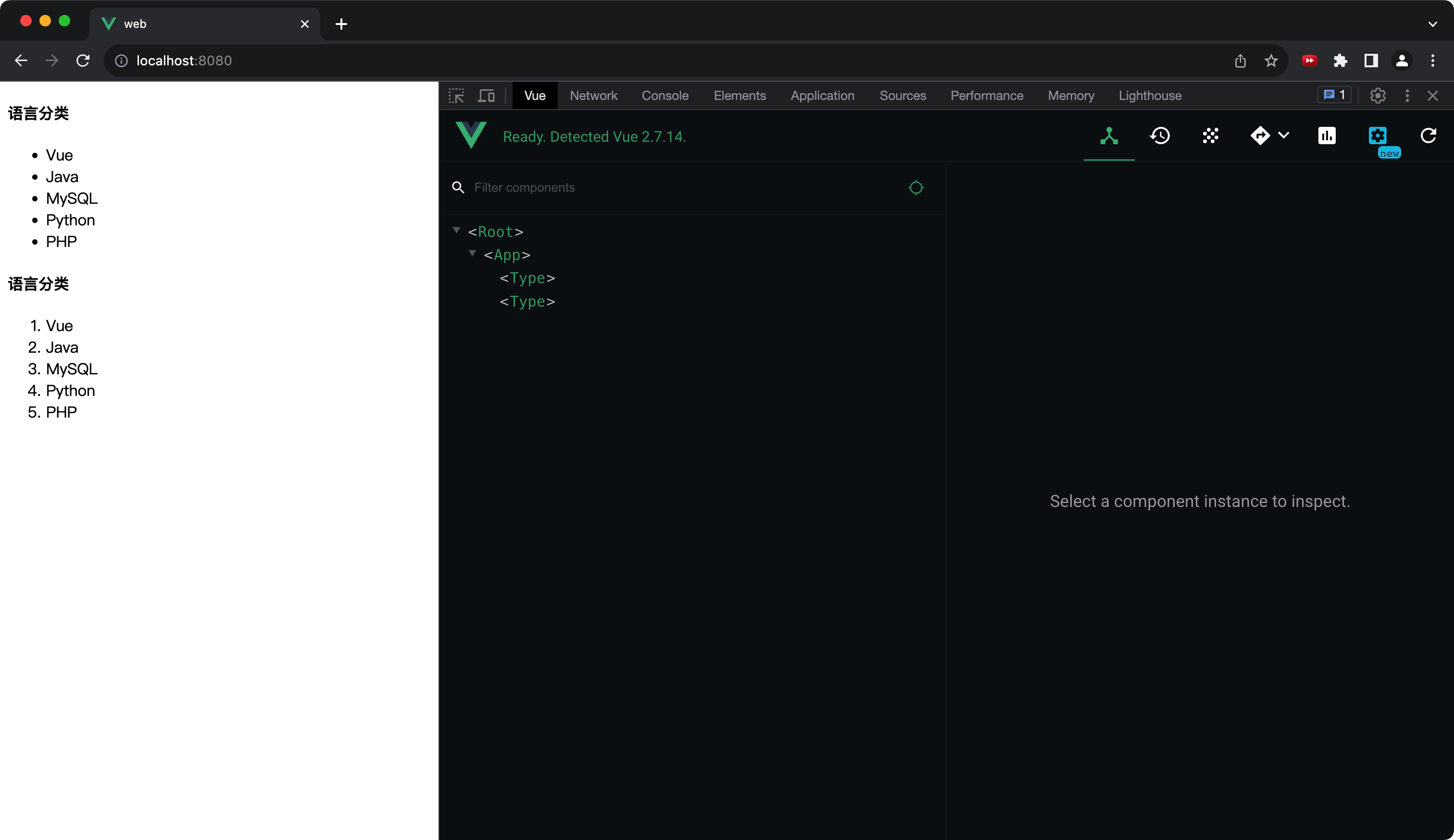 Vue<template> <div> <Type> <ul> <li v-for="(item, index) in language" :key="index">{{item}}</li> </ul> </Type> </div> </template> <script> import Type from './components/Type'; export default { name: 'App', components: {Type}, data() { return { language: ['Vue','Java','MySQL','Python','PHP'] }; }, }; </script>子组件 Type.vue