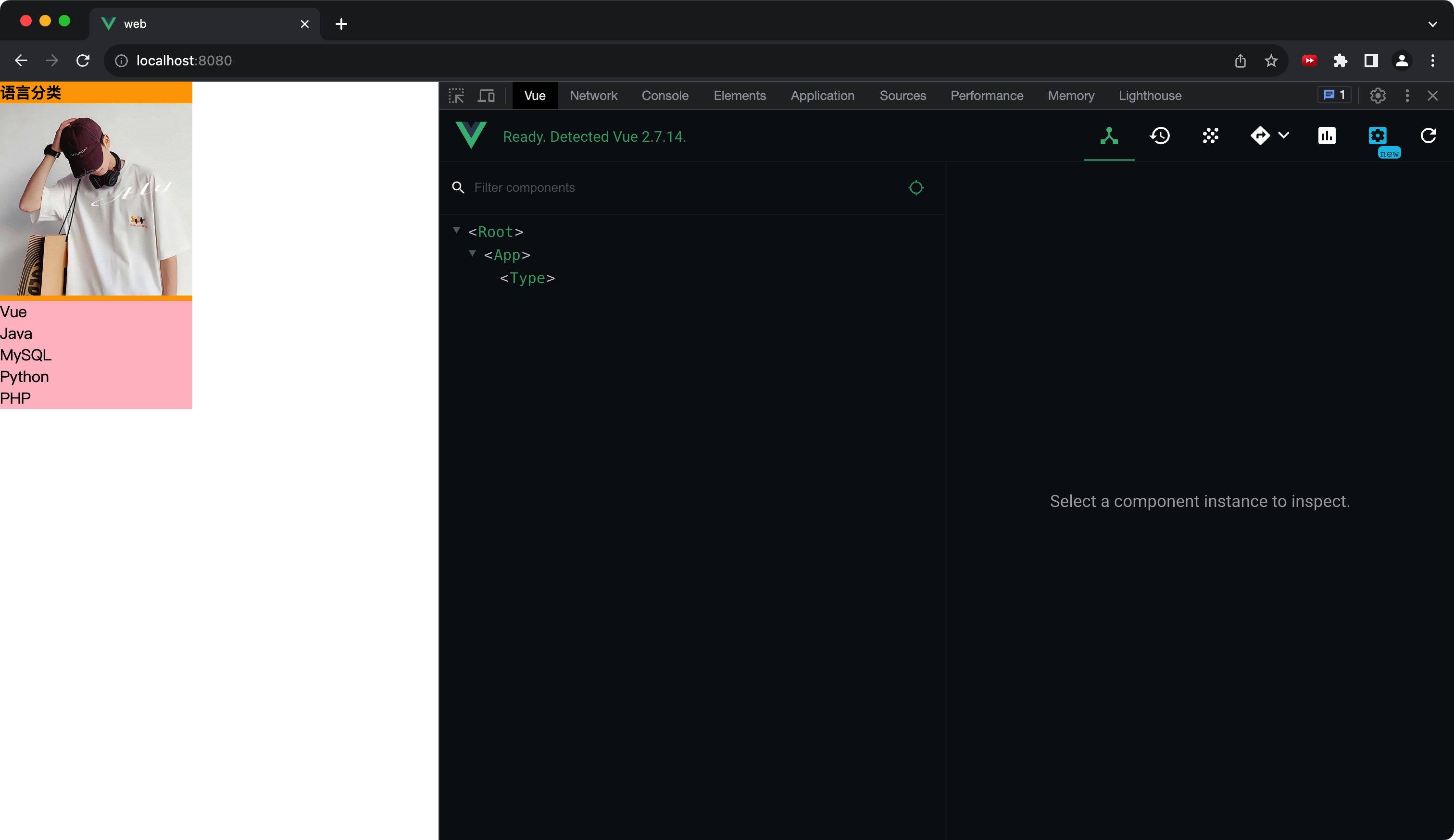 Vue<template> <div> <Type> <div slot="img"> <img src="https://my71.gitee.io/images/avatar.jpg"> </div> <ul slot="list" class="list"> <li v-for="(item, index) in language" :key="index">{{item}}</li> </ul> </Type> </div> </template> <script> import Type from './components/Type'; export default { name: 'App', components: {Type}, data() { return { language: ['Vue','Java','MySQL','Python','PHP'] }; }, }; </script> <style> * { margin: 0; padding: 0; } img { width: 200px; } .list { background-color: pink; } </style>子组件