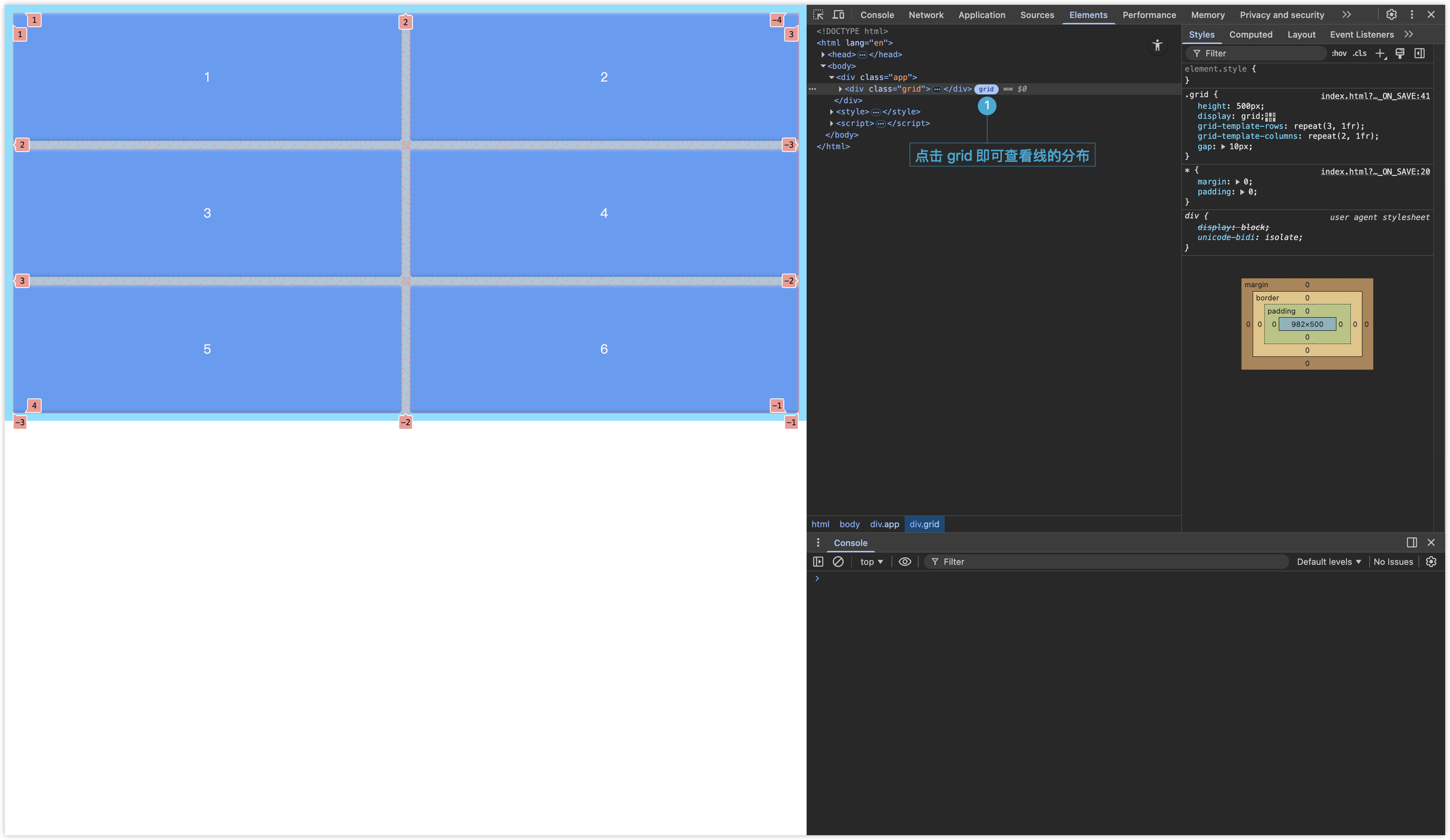 如果把一个网格划分为 3 行 2 列,那么将产生 4 条竖线和 3 条横线,每根线都有两个编号,一个为正数,一个为负数,借助浏览器的 Elements 面板可查看线的布局及编号。