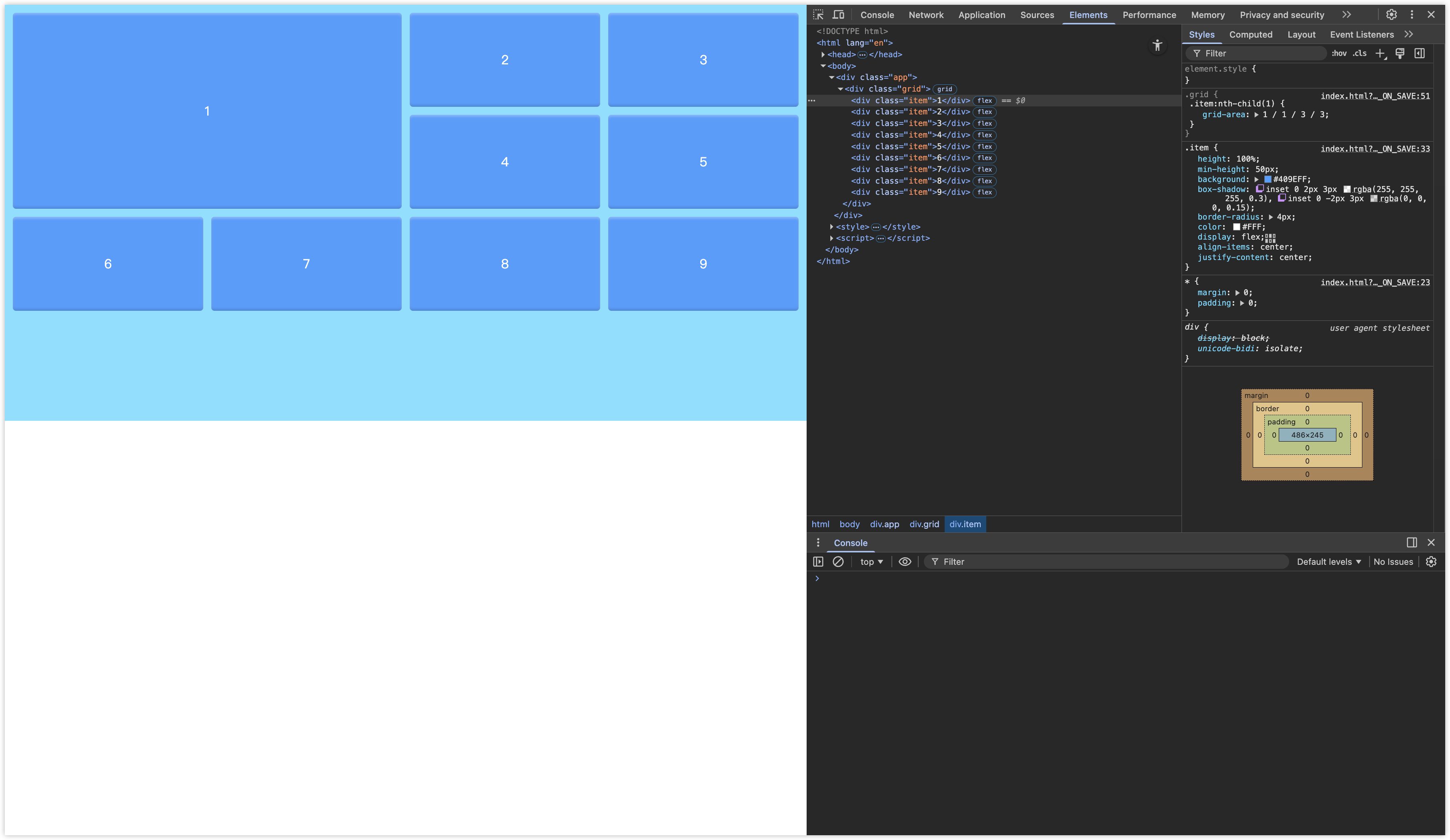 </style>在这段代码中我们把网格设置为 3 行 2 列,总共 6 个格子,也就是说 1~6 是显示网格,7~9 是隐示网格。