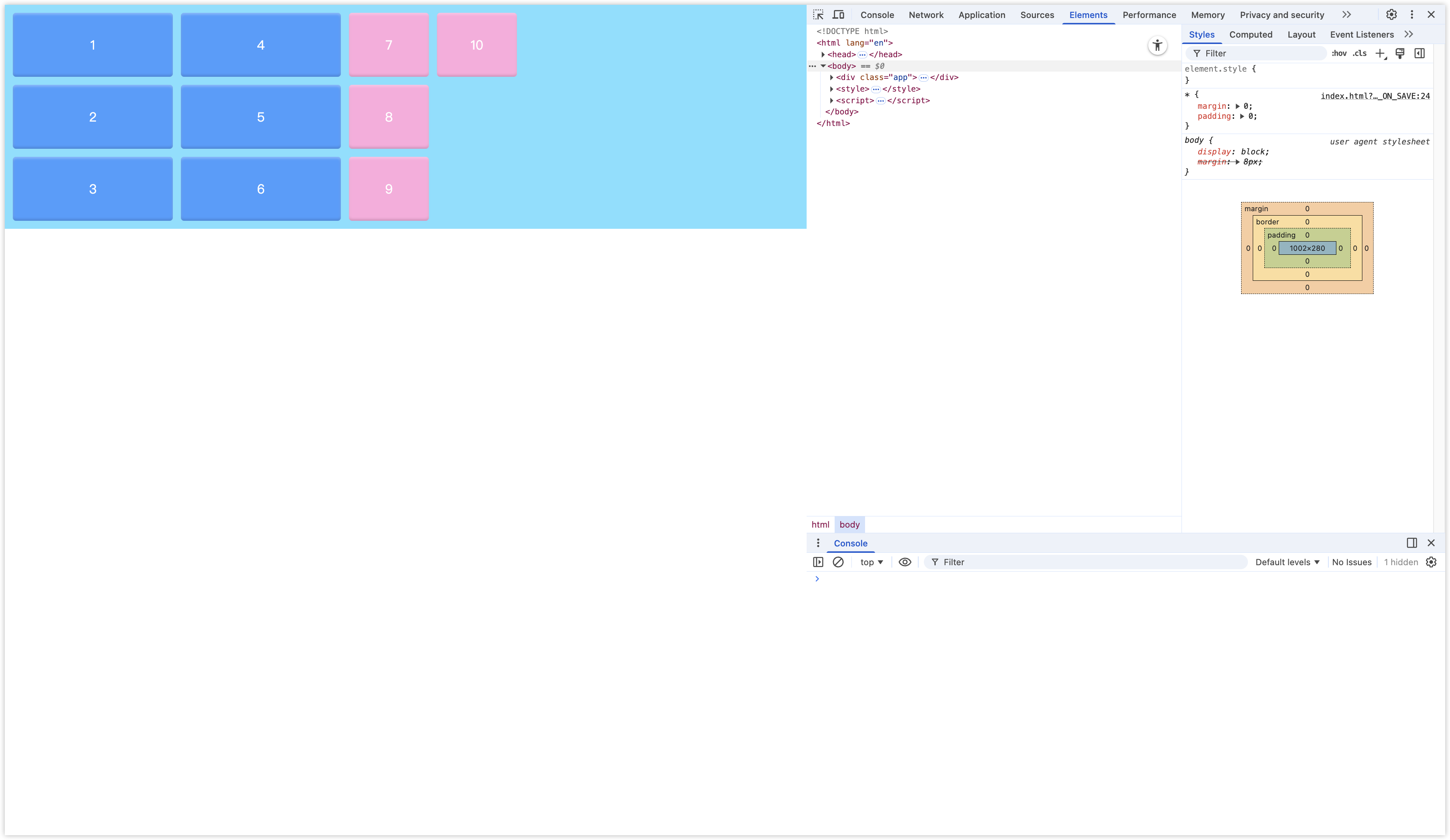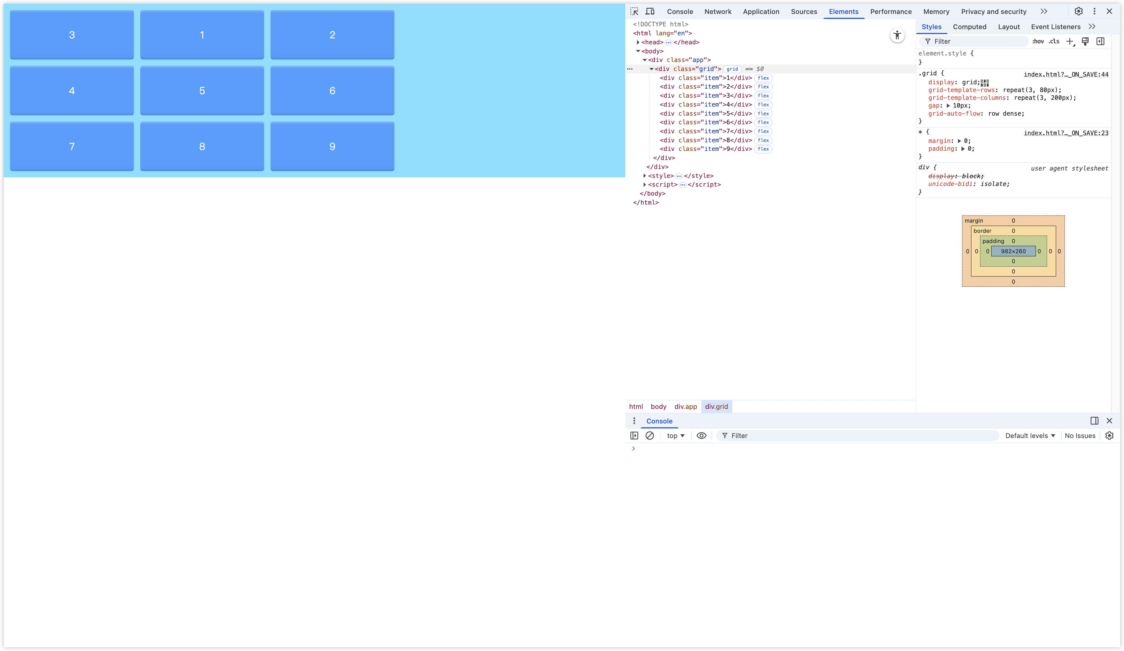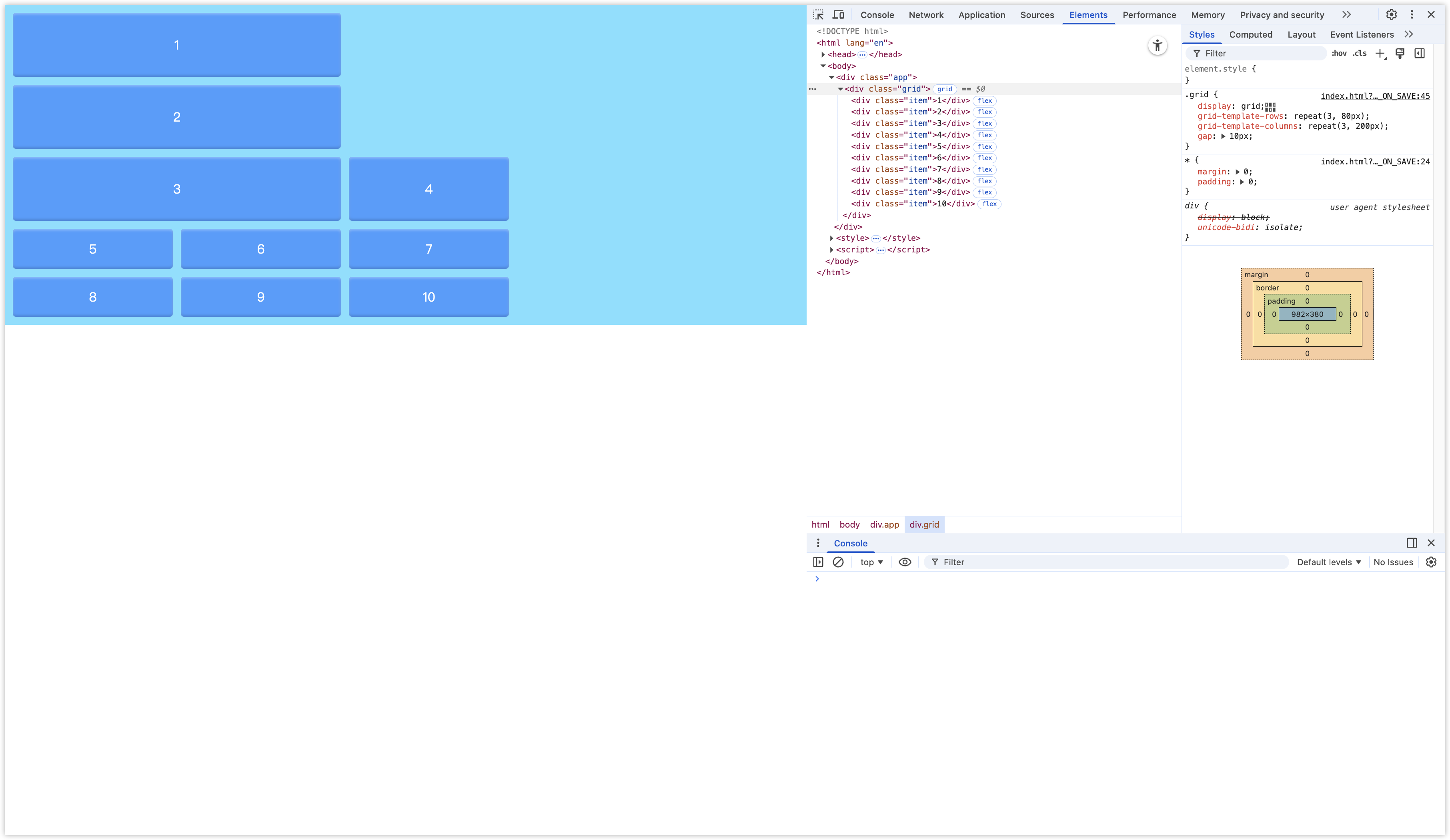启动 Grid 布局后,默认排列方式是行优先,当我们有 10 个子要素,但显示网格是这的是 3 行 2 列,这时隐示网格会继续向下增加行,直到 10 个子要素被填满。